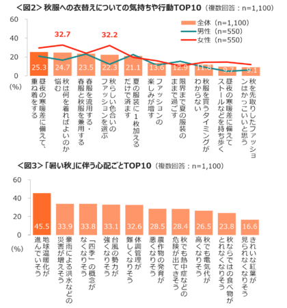 以下、上位には「秋は何を着ればよいのか悩む」、「春服を流用(兼用)する」が続いている。また、女性では「秋は何を着ればよいのか悩む」と「秋らしい色合いのファッションを選ぶ」が3割を超える。