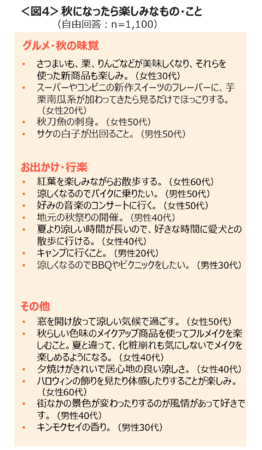 「栗」「梨」といったフルーツ類や「サンマ」などの秋ならではの「グルメ・食材」をあげる回答が多くみられる。また、「紅葉」や「行楽・レジャー」、「旅行」といった回答や、夏と比較しての「過ごしやすさ」「涼しさ」などに言及する回答も多い。<図4>