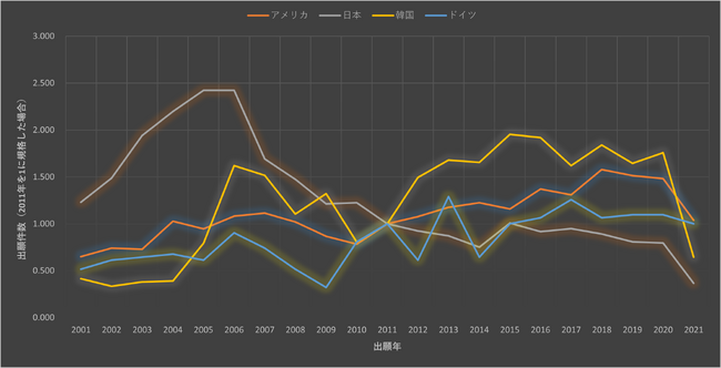中国は2011年と2021年の出願件数を比較すると、約16倍の増加となっています。中国以外の出願件数の増加・減少の傾向を見るため、図2に2011年の出願件数を1とした出願件数の推移を示しました。各国の出願件数の停滞傾向があきらかです。