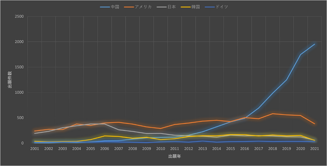 2001年以降で、44,000件あまりが出願されています。出願件数が2位のアメリカ、3位の日本、4位の韓国、5位のドイツの出願件数は全期間にわたり停滞の傾向にあります。しかし、1位の中国は2011年以降に急激な成長を始めました。