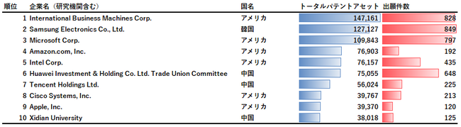 出願人別のランキングではアメリカのIBM Corp.が1位です。また、韓国のSamsung Electronics Co., Ltd.が2位、アメリカのMicrosoft Corp.が3位です。4位以降は上位3企業と大きく差が開いていることが分かります。
