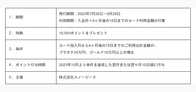 ※2 達成条件:カード加入月から6ヶ月後の15日分までのご利用金額の合計がプラチナ18万円、ゴールド12万以上の場合。ポイントは条件を達成した翌月または翌々月10日頃に1度のみ付与されます。