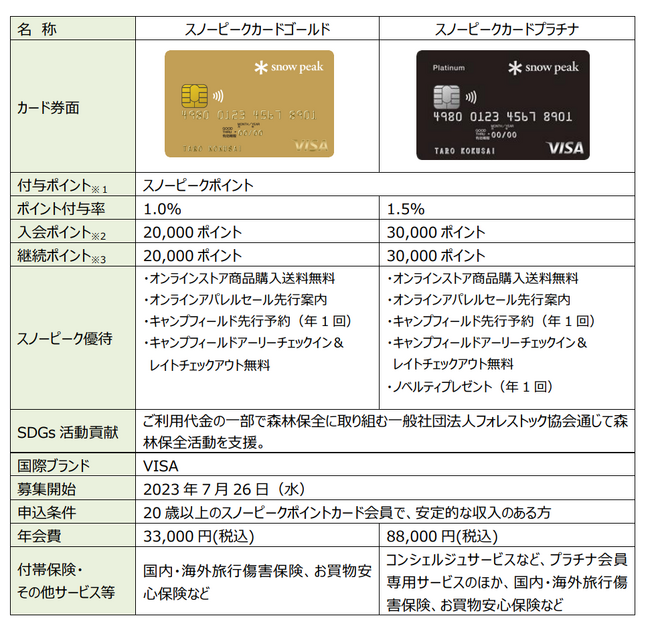 株式会社スノーピーク(本社:新潟県三条市、代表取締役 会長兼社長執行役員:山井太、以下:スノーピーク)と三井住友カード株式会社(本社:東京都江東区、代表取締役社長:大西幸彦、以下:三井住友カード)は、2023年7月26日(水)より、スノーピークポイントが貯まるクレジットカード「スノーピークカード」を発行します。また、カードの発行を記念して入会・利用キャンペーンを実施いたします。