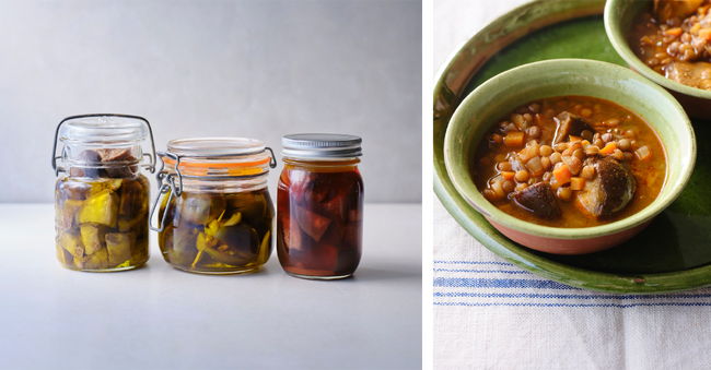 米なすのオイル漬け、小なすのオイル漬け、小なすのスパイス酢漬け/なすとレンズ豆の煮込み