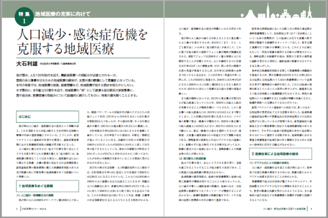 人口減少と少子高齢化が顕著になる中、住民の生命と健康を守るために地域医療の充実は欠かせません。中には医師や看護師の確保に苦心している地域もあり、医療施設の老朽化や経営体質の弱体化など、課題は挙げたらきりがありません。今回の特集では、地域医療が抱える現状を明らかにし、その将来的な安定と充実に向けた手法を探っていきます。