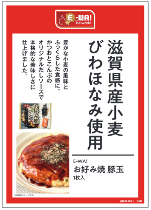 「E-WA! お好み焼き 豚玉」は、滋賀県産の小麦であるびわほなみを使用し、小麦の風味とふっくらもちっとした食感に仕上げました。また、こだわりのソースは、かつおとこんぶを使用しただしがきいたオリジナルで、生地にぴったりの美味しさです。