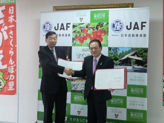 JAF(一般社団法人 日本自動車連盟)山形支部(鈴木寿昭支部長)と寒河江市(佐藤洋樹市長)は、3月19日「観光振興に関する協定」を締結しました。この協定は、寒河江市の観光振興とJAFの会員向けサービスについて相互に連携を強化し、双方の資源を有効活用して、寒河江市へのドライブ観光客誘致、観光振興およびJAF会員へのサービス向上に資することを目的としています。