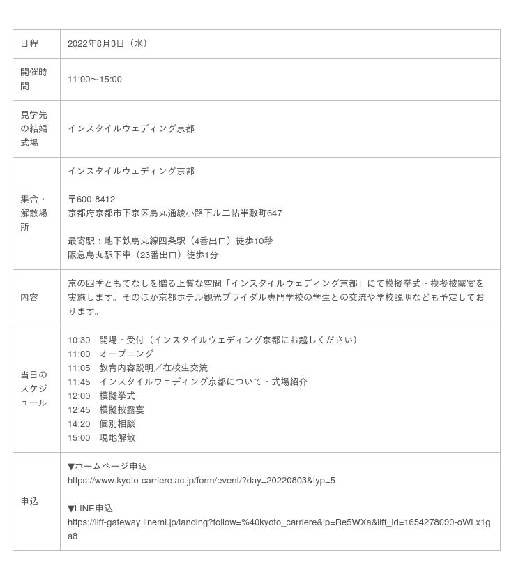 【京都ホテル観光ブライダル専門学校】8月3日(水)インスタイルウェディング京都にて高校生を対象とした「ブライダル見学フェスタ」を開催します