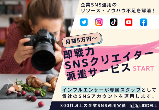 SNS・インフルエンサーマーケティング事業を展開するLIDDELL株式会社 (本社:東京都港区、代表取締役:福田 晃一、以下リデル) は、企業のSNSアカウントを支援する「即戦力SNSクリエイター派遣サービス」を、2022年6月より提供開始いたしました。