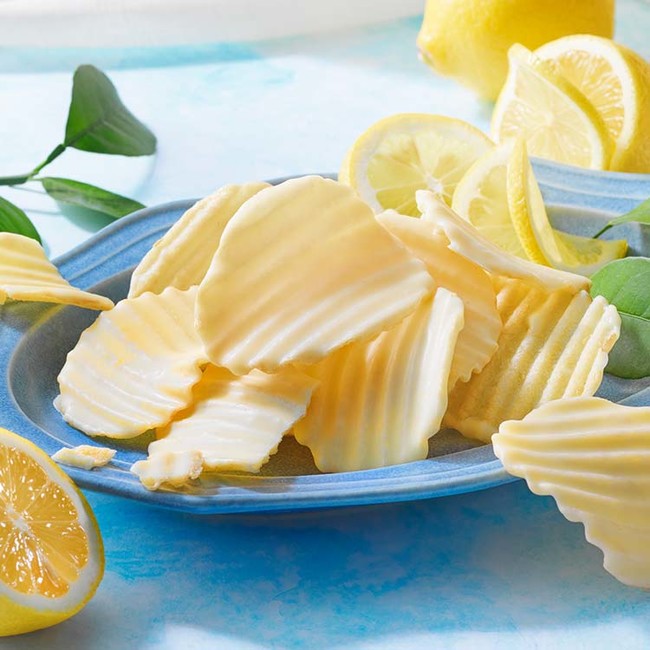 さわやかな酸味が特長のレモンチョコレートをポテトチップの片面にコーティング。レモンの味わいが引き立つよう、レモンチョコレートにはチーズ風味・ヨーグルト風味のチョコレートを隠し味に加えています。レモンのさわやかな香りと酸味、ポテトチップの塩味がひとつになって塩レモンを思わせる、夏に食べたいさっぱりとした味わいです。