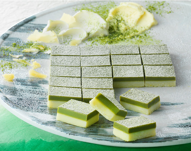 宇治抹茶をブレンドしたホワイトチョコレートと、北海道産の3種のチーズ(マスカルポーネ、ゴーダ、クリームチーズ)を使用したホワイトチョコレートを2層に重ね、宇治抹茶を使用したチョコレートのパウダーをかけました。