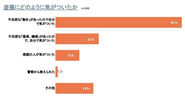 盗撮された人に、盗撮にどのように気がついたかを尋ねたところ、不自然な「動き」があったので自分で気がついたが66.3%、不自然な「器具、機械」があったので、自分で気がついたが22.8%、周囲の人が気がついた12.6 %、警察から教えられた1.2%、その他19.9%と続きました。(複数回答)
