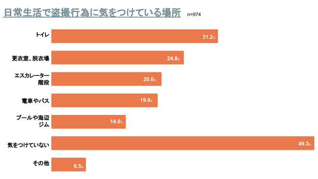日常生活で盗撮行為に気をつけている場所を尋ねたところ、「トイレ」が31.2%、「更衣室、脱衣場」が24.8%、「エスカレーター、階段」が20.6%、「電車やバス」が19.9%、「プールや海辺、ジム」が14.0%、「気をつけていない」が49.3%、「その他」が6.5%となりました。(複数回答)