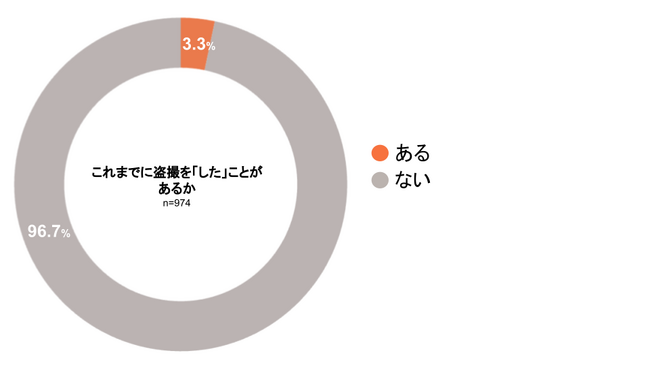 これまでに盗撮をしたことが「ある」かを尋ねたところ、「ある」が3.3%、「ない」が96.7%となりました。
