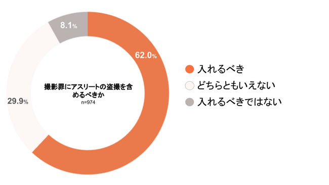 次に、撮影罪では、アスリートの盗撮(競技中のアスリートの股間等を盗撮すること)は処罰の対象外となりましが、アスリートの盗撮を含めるべきかを尋ねたところ、「入れるべき」が62.0%、「どちらともいえない」が29.9%、「入れるべきではない」が8.1%となりました。