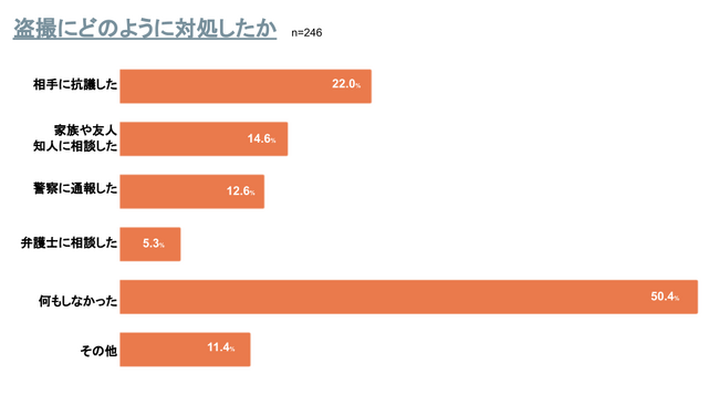 盗撮された人に、 盗撮に対してどのように対処したかを尋ねたところ、「相手に抗議した」が22.0%、「家族や友人に相談した」が14.6%、「警察に通報した」が12.6%、「弁護士に相談した」が5.3%、「何もしなかった」が50.4%、「その他」が11.4%となりました。(複数回答)
