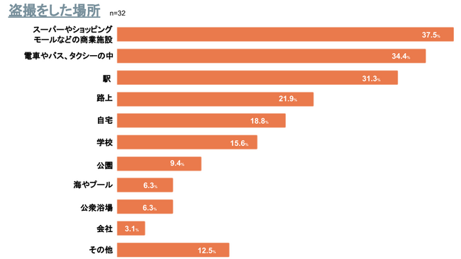 盗撮をしたことが「ある」人に、盗撮した場所を尋ねたところ。「スーパーやショッピングモールなどの商業施設」が37.5%、「電車やバス、タクシーの中」が34.4%、「駅」が31.3%と人が多く集まる場所が上位を占めました。結果は以下の通り。