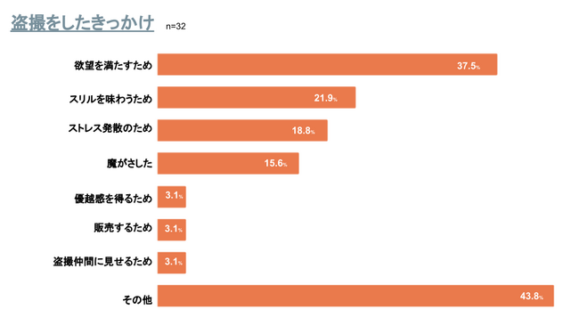 盗撮をしたことが「ある」人に、盗撮をしたきっかけについて尋ねたところ、「欲望を満たすため」が37.5%、「スリルを味わうため」が21.9%、「ストレス発散のため」が18.8%、「魔がさした」が15.6%、「優越感を得るため」、「販売するため」、「盗撮仲間に見せるため」がそれぞれ3.1%となりました。