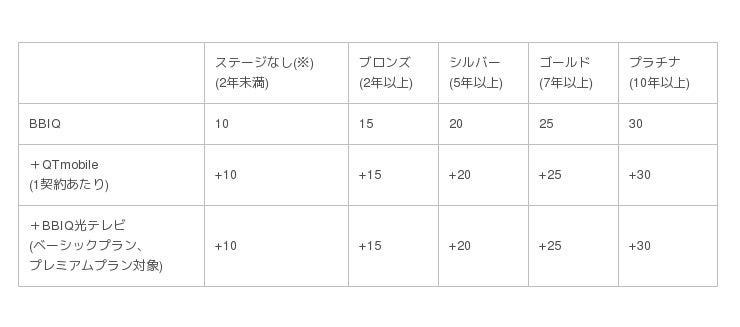「BBIQ」をご利用いただくと、ご利用期間をもとに算出したステージに応じ、毎月Pontaポイントがたまります。また、新スマホサービス「QTmobile」や、光ファイバーを使ったテレビ放送サービス「BBIQ光テレビ」にも加入している場合、たまるPontaポイントが追加となります。最上位ステージの方で、「BBIQ」に加えて、QTmobile、BBIQ光テレビのご利用で毎月90Pontaポイントがたまります。