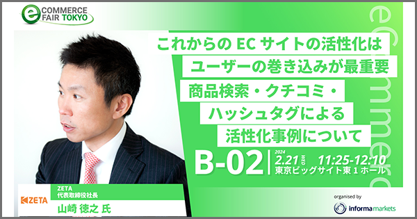 EC商品検索・レビュー・ハッシュタグ・ECキュレーション・OMOソリューションを開発販売するコマースとCXのリーディングカンパニーであるZETA株式会社(本社:東京都世田谷区、以下ZETA)は、2024年2月21日(水)・22日(木)にインフォーマ マーケッツ ジャパン株式会社が開催する『イーコマースフェア 東京 2024』にてブース出展し、1日目には代表の山崎が「これからのECサイトの活性化はユーザーの巻き込みが最重要 商品検索・クチコミ・ハッシュタグによる活性化事例について」と題したセミナーに登壇いたします。