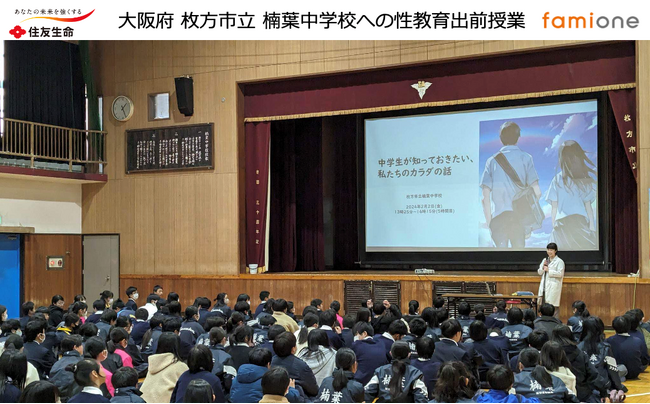 住友生命とファミワンの共創プロジェクトの一環として、大阪府枚方市立楠葉中学校にて性教育の出前授業を開催