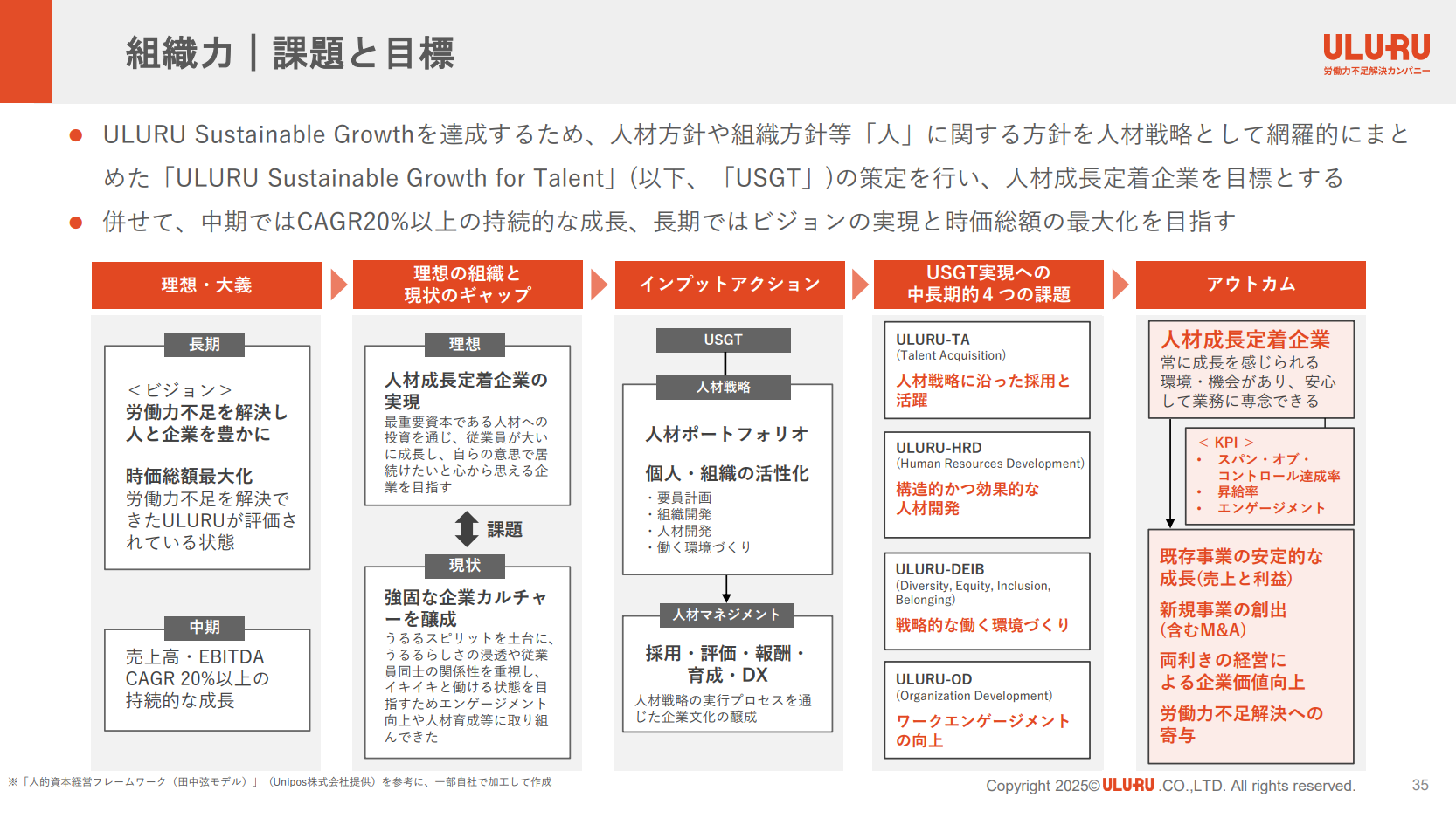 2025 年度版では特に代表の星をはじめとする経営陣のコミットメントや、経営戦略と現場での実践を結びつけるための人材戦略 「ULURU Sustainable Growth for Talent」の核となる課題を明示しています。これら4つの課題が有機的に連携することで、うるるが目指す「人材成長定着企業」の実現と、企業価値の最大化をより一層加速させてまいります。