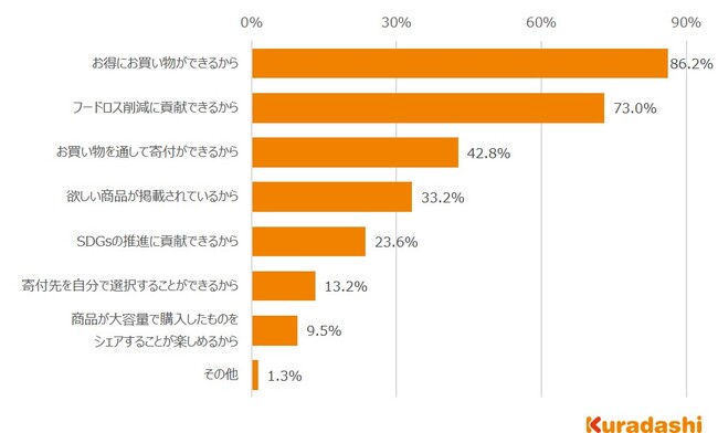 「Kuradashi」を利用する理由として最も多かった回答は「お得にお買い物ができるから」で86.2%、次いで多かった回答は「フードロス削減に貢献できるから」で73.0%でした。