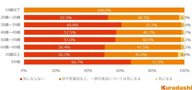 19歳を除いたすべての年代で「気にならない」という回答が50%を超えていますが、60歳〜69歳、70歳以上では約50%と相対的に低く、その他を除いて最も多かったのは30歳〜39歳で60.8%でした。調査結果3(よりお得に食品を購入したいと思うか)と併せても、「若い世代の方がより価格の安さを重視する傾向にある」と推察されます。