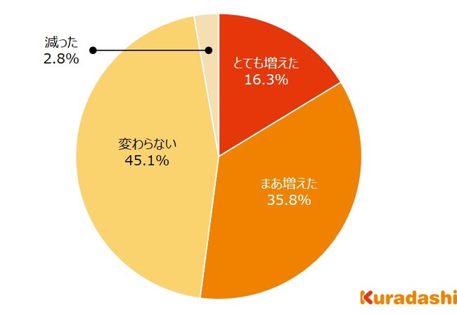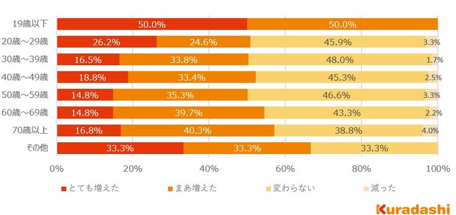 19歳以下、その他を除くと、「とても増えた」と「まあ増えた」の合計が最も多かったのは70歳以上で57.1%でした。