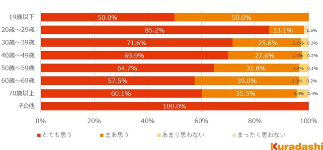 その他を除くと、「とても思う」と回答した方が最も多かったのは20歳〜29歳で85.2%でした。「とても思う」と回答した割合は年代が上がるにつれて減少する傾向にあり、若い世代の方がより物価高騰を受けて「よりお得に食品を購入したい」と考えていることがわかります。