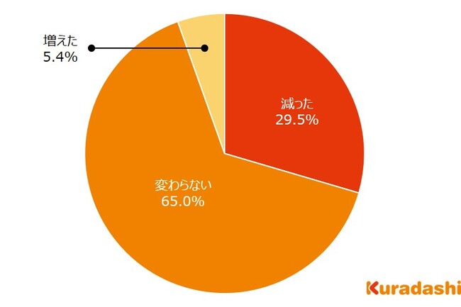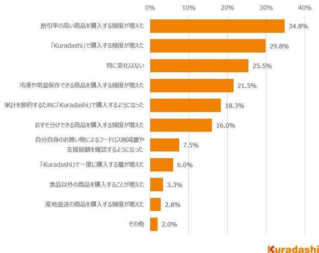 「割引率の高い商品を購入する頻度が増えた」と回答した方が最も多く34.8%で、よりお得感を求めて「Kuradashi」を利用していることが推察されます。次いで多かったのが「『Kuradashi』で購入する頻度が増えた」で29.8%でした。