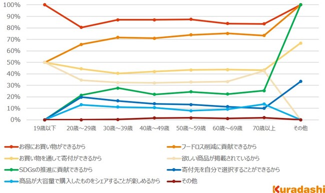 「Kuradashi」を利用する理由について、各回答の割合に年代ごとに大きな差は見られませんでした。