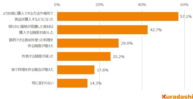 「よりお得に購入できる方法や場所で食品を購入するようになった」という回答が最も多く57.1%、次いで「明らかに価格が高騰した食材は購入する頻度を減らした」が42.7%でした。