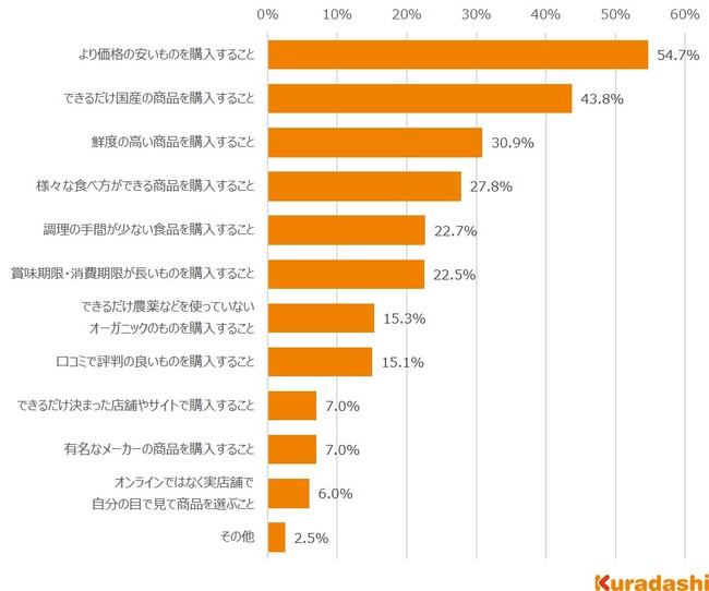 最も多かった回答は「より価格の安いものを購入すること」で54.7%、次いで「できるだけ国産の商品を購入すること」で43.8%でした。
