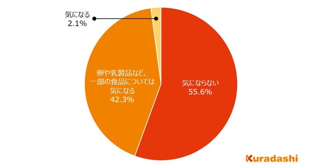 「気にならない」と回答した方は55.6%、「卵や乳製品など、一部の食品については気になる」と回答した方は42.3%でした。多くの方が、賞味期限の長さよりも価格の安さを重視する傾向にあると言えます。