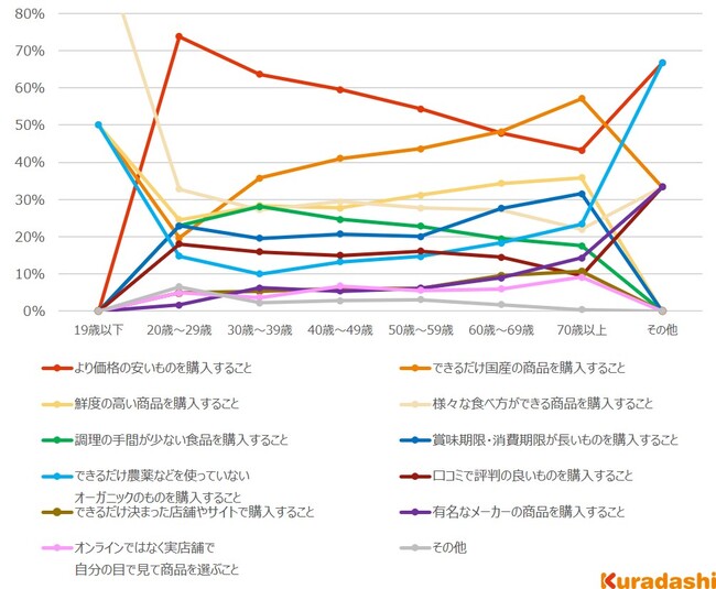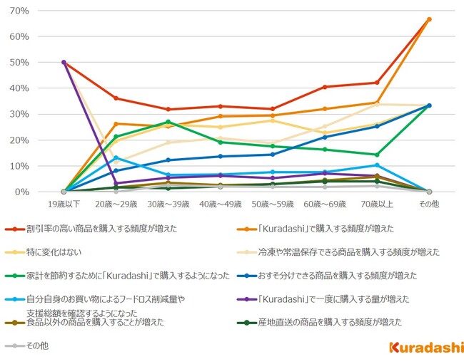 30歳〜39歳では、「家計を節約するために『Kuradashi』で購入するようになった」という回答が2番目に多く、他の年代と比較して家計節約の目的での「Kuradashi」利用が増えています。60歳〜69歳、70歳以上では「割引率の高い商品を購入する頻度が増えた」、「冷凍や常温保温できる商品を購入する頻度が増えた」、「おすそ分けできる商品を購入する頻度が増えた」という回答が他の年代と比較して多くなっています。