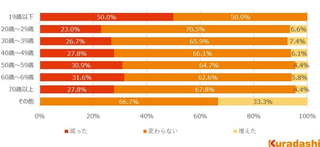 19歳以下を除くと、「減った」という回答が30%を超えているのは50歳〜59歳、60歳〜69歳でした。
