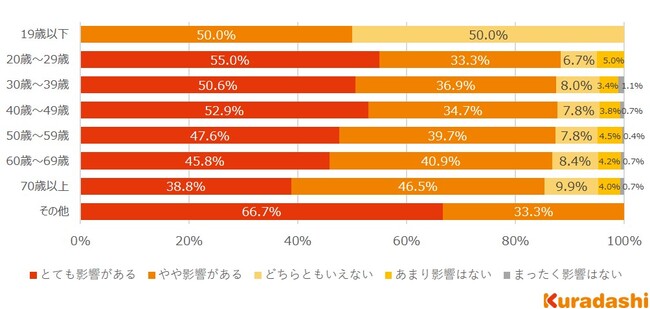 年齢別では「とても影響がある」と回答した方が50%を超えたのは、20代〜40代とその他という結果でした。40代以降は、年代が上がるにつれて「とても影響がある」と回答した方の割合が減少しており、物価高騰は特に20代〜40代の働き盛りの世代に対してより深刻な影響を与えていると言えます。