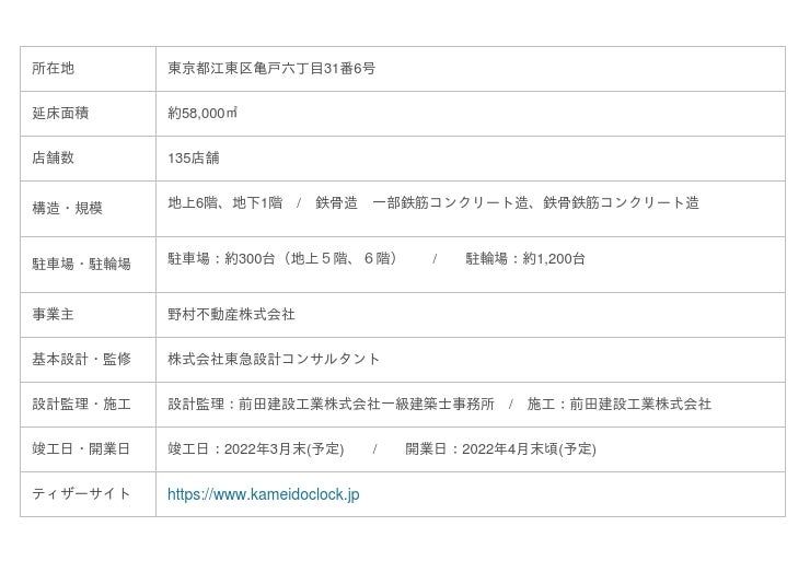 野村不動産株式会社(本社:東京都新宿区/代表取締役社長:松尾 大作)及び、野村不動産コマース株式会社(本社:東京都新宿区/代表取締役社長:小島 達也)は、東京都江東区亀戸において、当社グループのフラッグシップ商業施設『KAMEIDO CLOCK(カメイドクロック) 』を2022年4月末に開業することとなりましたのでお知らせいたします。