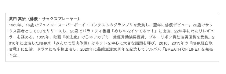 俳優やナレーター、サックスプレーヤーなど、幅広いジャンルで活躍し自らの領域を広げていくだけにとどまらず、更に2020年度においては筋肉体操など新しいチャレンジをされる姿が、アラフィフ世代をはじめ幅広い世代に元気を与える活躍をされた武田真治さんを選出させていただきました。