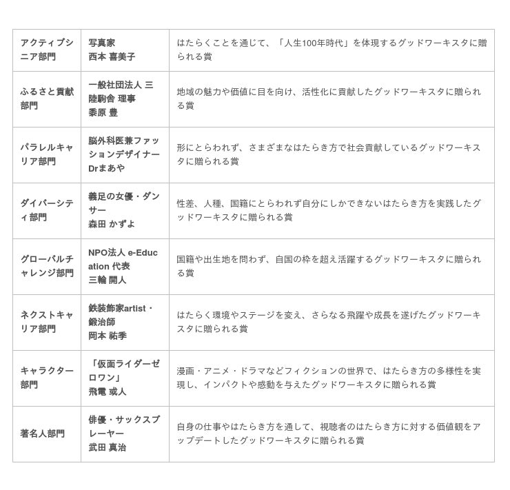 昨年に続き2回目となる今年度は、受賞者それぞれの「ワークスタイル」により一層フォーカスすべく、「多様なはたらき方」を軸に部門名を刷新しました。また、新たなフィールドやはたらき方に挑戦し、多くの方々のはたらき方に対する価値観をアップデートした著名人を表彰する「著名人部門」と、漫画・アニメ・ドラマなどフィクションの世界で、はたらき方の多様性を実現し、社会に対してインパクトや感動を与えたキャラクターを表彰する「キャラクター部門」の2部門を新設しました。