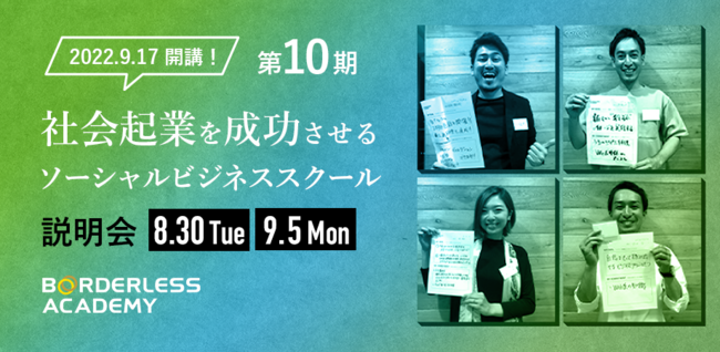 ソーシャルビジネス業界最大手の株式会社ボーダレス・ジャパン(代表取締役 田口一成/東京都新宿区)が運営する社起業家養成所「ボーダレスアカデミー」は、2018年10月の開校以来、累計650名以上が受講しました。(東京校・福岡校・オンライン受講)10期の開講にあたり2022年8月30日(火)、9月1日(月)にオンライン説明会を開催することとなりましたのでお知らせいたします。