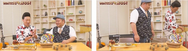 みやぞんさん、あらぽんさんが弊社からの依頼を受け、机に並べられた様々な楽器を使って、食べた感想と商品の特徴を盛り込んだ即興曲を作り上げます。