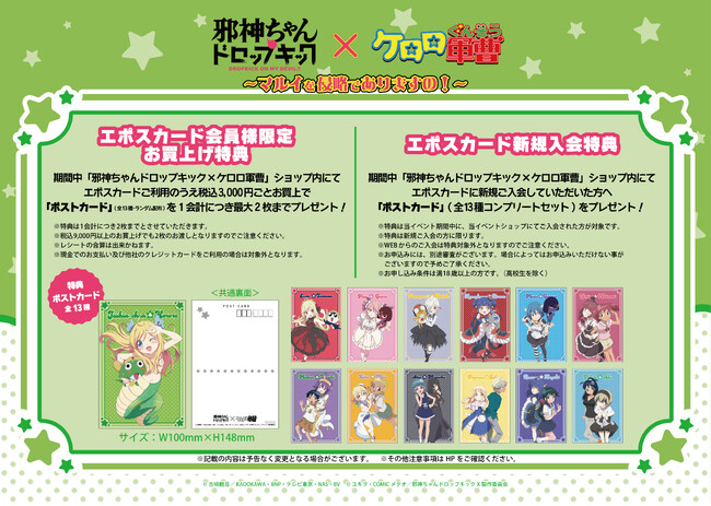 期間中、「邪神ちゃんドロップキック×ケロロ軍曹」ショップ内にてエポスカードご利用のうえ税込3,000円ごとお買上で「ポストカード」(全13種・ランダム配布)を1会計につき最大2枚までプレゼント!