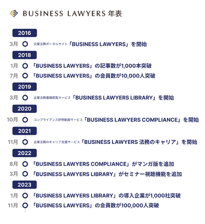 「BUSINESS LAWYERS(R)」は、企業法務のポータルサイトとしてスタートしました。その後、企業法務の課題解決に向けて、一連の新たなサービスを続々と展開しました。これらには、企業法務書籍閲覧サービスの「BUSINESS LAWYERS LIBRARY(ビジネスロイヤーズライブラリー)」、コンプライアンス研修動画サービスの「BUSINESS LAWYERS COMPLIANCE(ビジネスロイヤーズコンプライアンス)」、そして企業法務のキャリア支援サービス「BUSINESS LAWYERS 法務のキャリア」が含まれます。これら全てのサービスを通じて、「BUSINESS LAWYERS(R)」は日本の企業法務を支え続けています。