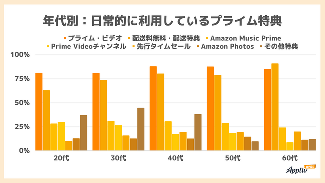 最も日常的に使うプライム特典は「プライム・ビデオ」。若い世代ほど「配送料無料」より「プライム・ビデオ」を利用。