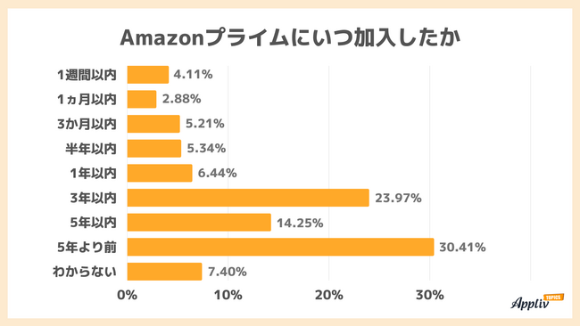 Amazonプライムに加入した時期は「5年より前」30.41%、「3年以内」23.97%、「1年以内」23.98%。