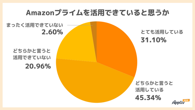最多は「どちらかと言うと活用している」が45.34%。「とても活用している」と合わせると、76.44%が「Amazonプライム」を活用できていると感じています。