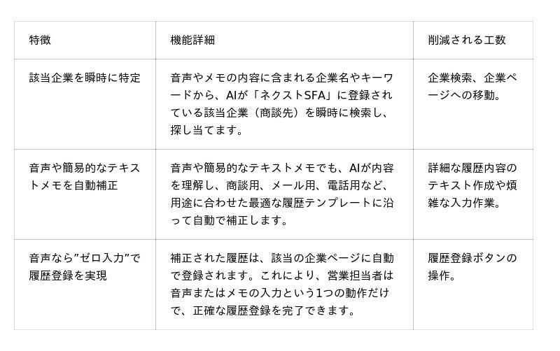 本機能は、「ネクストSFA」での履歴登録に必要だった「企業検索」「企業ページに移動」「履歴登録」といった複数のステップが、音声入力なら1ステップで履歴登録を完了することができます。