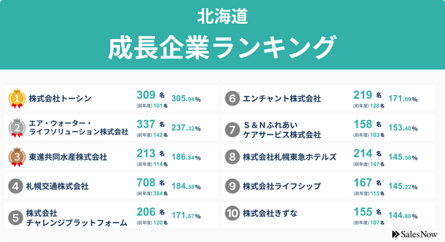「誰もが活躍できる仕組みをつくる。」をミッションに掲げ、セールスチームの武器となるデータベース「SalesNow」を展開する株式会社SalesNow(本社:東京都渋谷区、代表取締役:村岡功規、以下「SalesNow」)は、国内540万社の企業情報を完全網羅した日本最大級のデータベース「SalesNow DB」より、北海道に本社を置く企業の成長企業ランキングTOP50を調査しました。